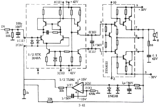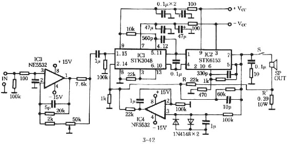 STK3048 and STK6153 simpler internal circuitry, and its sound quality is very good. 3-42 However, the external circuit design and the choice of external components a greater impact on IC sound quality, so the amplifier using the circuit shown in Figure 3-42.