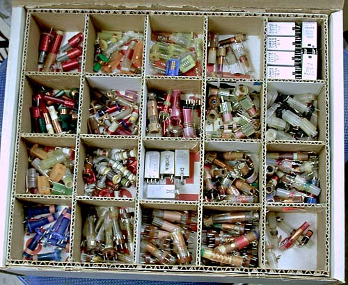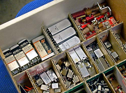 There's numerous trays of coils, coil forms, cans, etc. plus many more with vaious forms of ferrite coils and bare ferrite cores. Listing all these items would take more time then I have plus it's not really worth doing so considering what they are worth, but e-mail if you're interested in a number of a particular type, inductance range or some other parameter to help me select which one's you would prefer and be most useful to you and I'll put together a bag full for $5 or so.